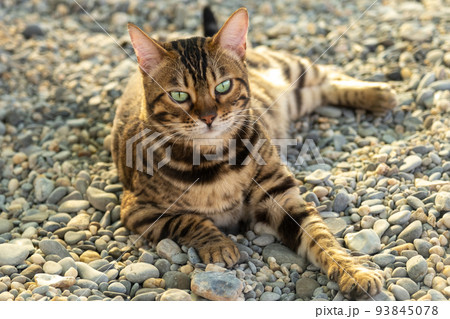 Portrait of a beautiful Bengal cat. The cat lies on small stones. Red spotted and tabby cat with green eyes. summer portrait