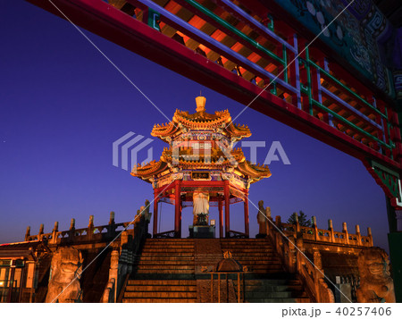 宮廷建築様式「夕焼け光芒を背景に石像・宮廷風景」観光名所:有明の里 泗水孔子公園