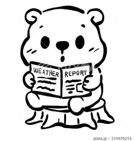 Kawaii groundhog reading weather report cute woodland animal line art adorable forecast illustration sitting on tree stump simple black and white cartoon style