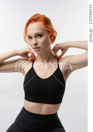 Woman in brown lingerie sitting on stool in relaxed pose expressing confidence and softness