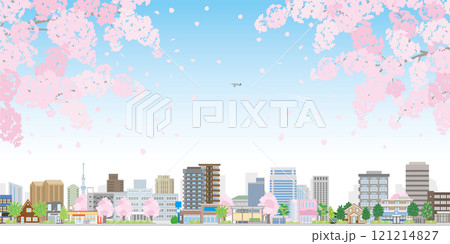 桜咲く春の街並みのイラスト.