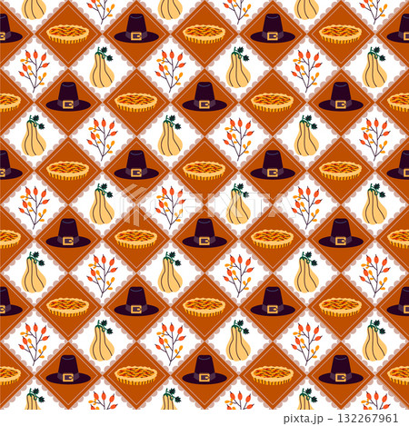 Thanksgiving seamless pattern with hats pies squash and foliage in hand-drawn flat cartoon style