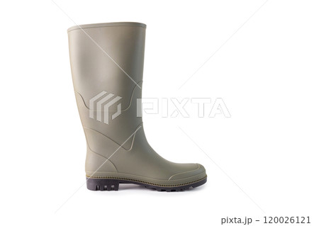 a single, tall rubber boot, commonly known as a rain boot, olive green in color and has a textured sole for better grip. The design is simple and functional, with a smooth surface minimal decorative