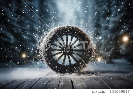 a car wheel on the background of a winter road and a beautiful night landscape, a snow-covered forest with lights, a concept of traffic safety on a slippery road