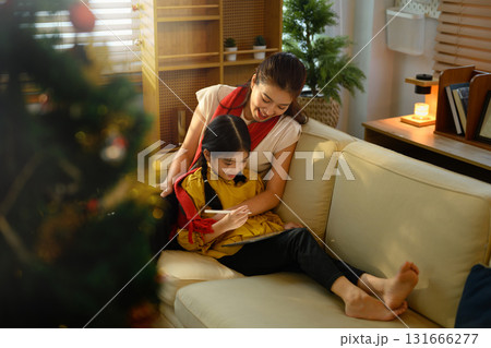 Happy mother and daughter using digital tablet while sitting together on sofa during Christmas season