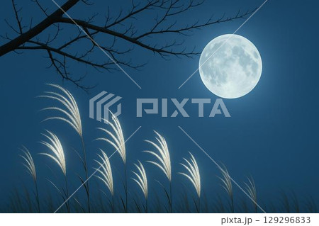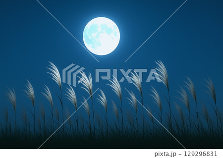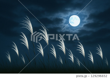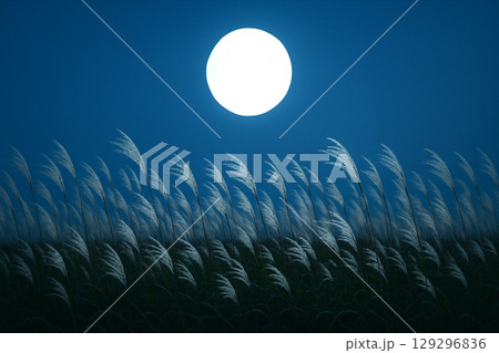秋の満月とススキの幻想風景 季節感あふれる夜の自然素材