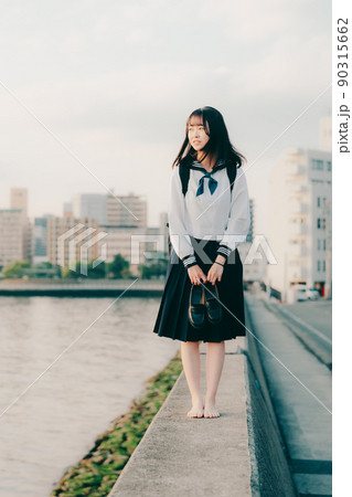 微笑む女子高生の後ろに流れる時間|感情系素材