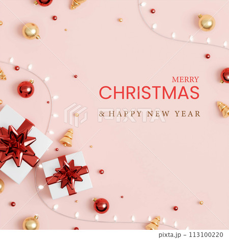 Christmas banner. Background Xmas design of sparkling lights garland, with realistic gifts box, glitter gold confetti. square New Year poster, greeting card, header, website. 3d render