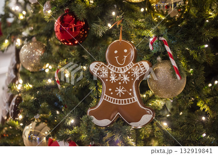 christmas tree for christmas with a garland and with decorations and with a gingerbread man