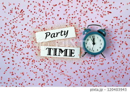 Party Time announcement card with clock and confetti on pink backdrop