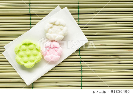 お盆で敷く真菰と盆菓子 御供菓子 和菓子 干菓子 落雁 まこも お盆 ゴザ 背景素材