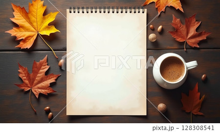 Autumn leaves with notepad and coffee on wooden table, cozy seasonal scene. Space for text