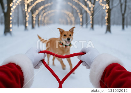 Santa dog playing in snowy park with holiday lights and red leash on winter day. concept of christmas festivity, playful pet, seasonal joy.