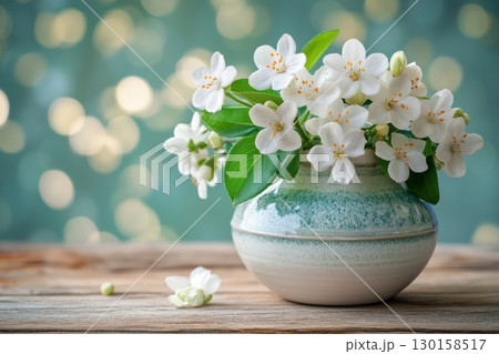 Beautiful white jasmine flowers in a decorative vase on a wooden table with a bokeh background