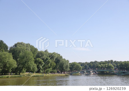 View of the pond and Tsaritsynsky park on a sunny summer day, Moscow, Russia, July 2022.