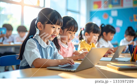 明るいモダンな教室でAI搭載教育ツールを使って学ぶ子どもたちの未来的イラスト