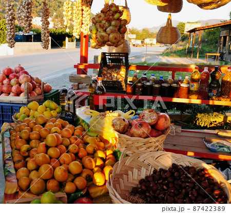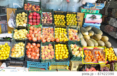 アルバニア ドウラス 街道沿いの果物屋に並ぶ甘柿Diospyros kaki
