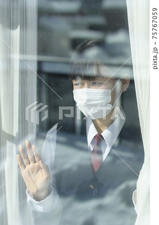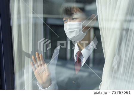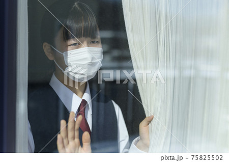 窓から外を見る中学生(外出自粛要請のイメージ)