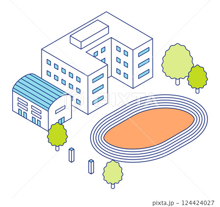 アイソメトリックの学校のイラスト。3Dの校舎、体育館、陸上競技場、校庭。