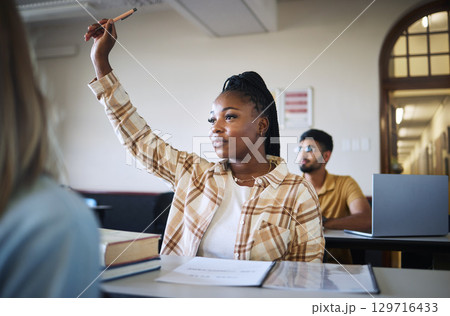 College student, black woman and hands to answer question in classroom for teaching, school education or learning. University student with raised hand for asking questions, studying or campus lecture