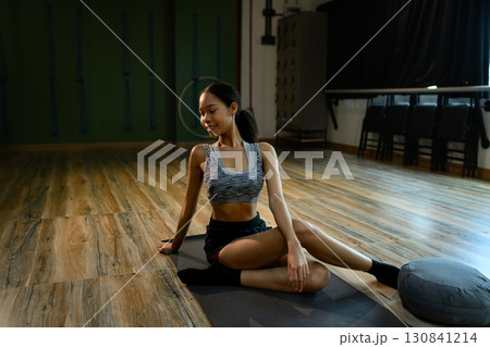 Young woman performing yoga exercise on wooden floor. Healthy lifestyle concept