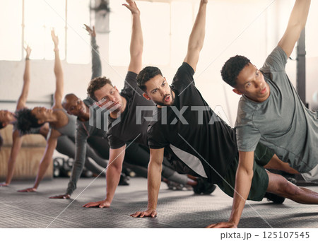 Teamwork, fitness or sport team stretching in gym, studio or arena floor for wellness, exercise or sports workout. Diversity, health or athlete group for warm up, motivation or cardio team building