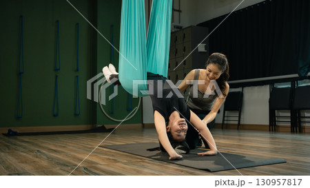 Female trainer assisting young woman in aerial yoga inversion using hammock fabric
