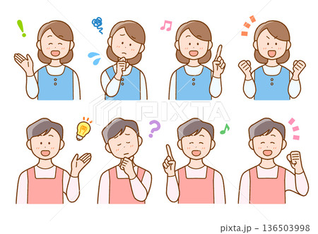 エプロン姿のスタッフ(男女)イラスト8点セット|保育・介護・福祉