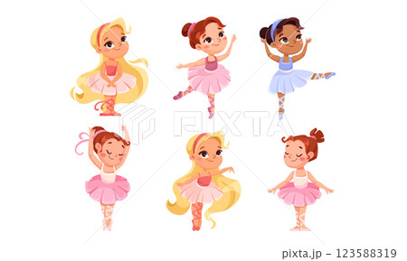 Cute Girl Ballerina in Tutu Skirt and Pointe Shoes Dancing Ballet Vector Set