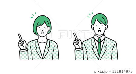 イラスト素材:指差しで説明するスーツを着た若い男女のセット