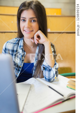 Working female student taking notes on notebook at university lecture hall desk, using laptop