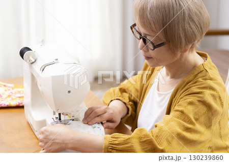 ミシンで洋服や小物を楽しそうに縫うシニア女性