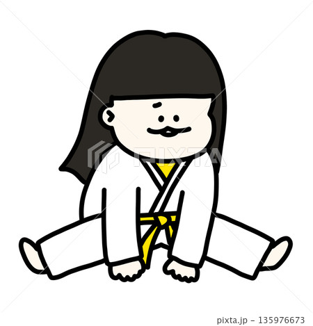 体が硬く苦戦する道着姿の女性 開脚ストレッチ 柔軟 筋トレ