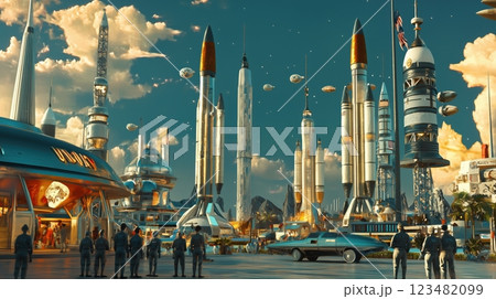 レトロフューチャーなロケット発射基地と未来都市