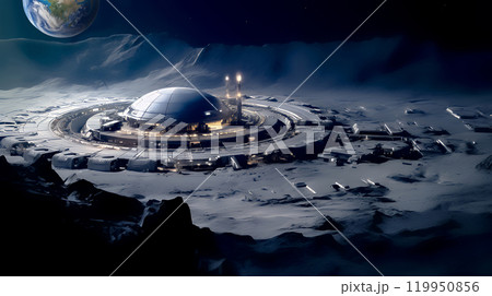 "氷の表面を走る月探査車、大地の背後に昇る地球をバックグラウンドに.<AI生成素材>