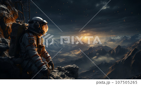 Majestic sunset view from a rocky outcrop with an astronaut contemplating the cosmic landscape