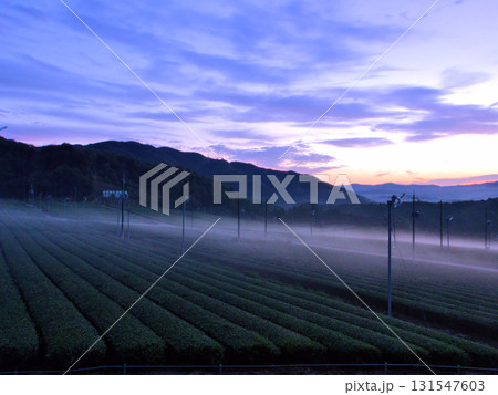 京都府南部・宇治田原町の朝霧に包まれた茶畑の日の出の風景