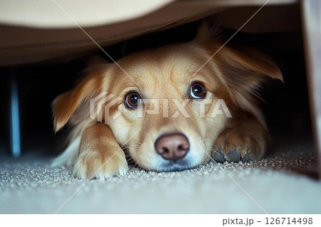ベッドの下に避難する怖がりの犬、地震や雷などにおびえる