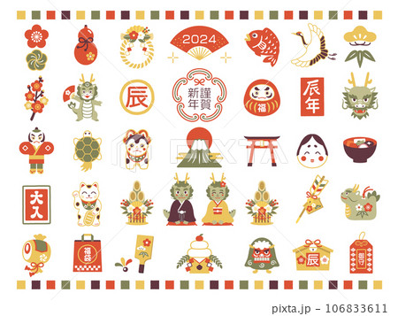 2024年 辰年 お正月の縁起物アイコンイラストセット