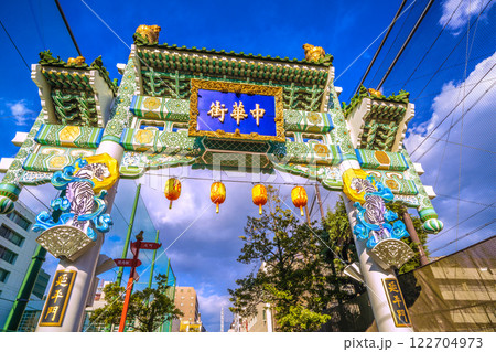 日本の横浜都市景観 白虎が登場。脱コロナ…平和と平安…横浜中華街の延平門などを望む