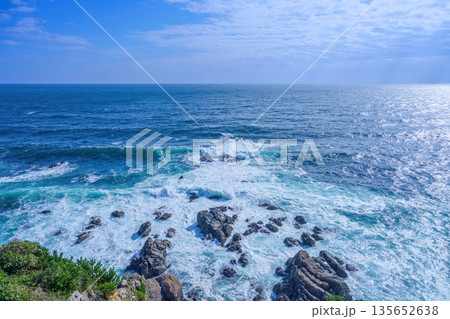 安乗埼灯台から見た岩礁に打ち寄せる青い海の白波と美しい水平線の風景
