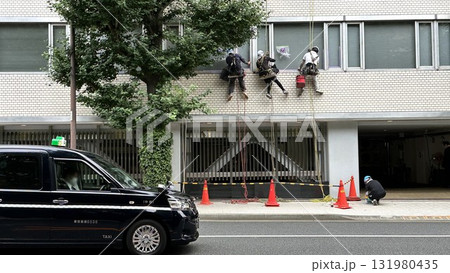 ロープアクセス工法を用いたビルメンテナンスの様子