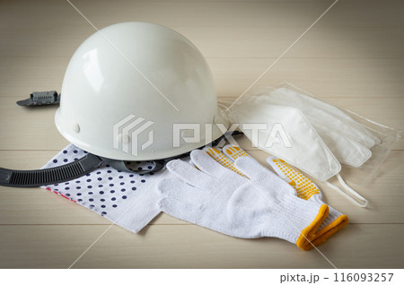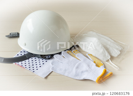 防災用ヘルメットと軍手、マスク、手拭 災害ボランティア 防災アイテム