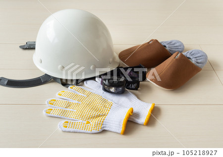 防災用ヘルメットと軍手、スリッパ、ヘッドライト 防災アイテム 準備