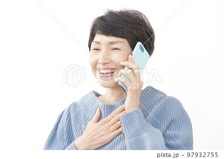 スマホで電話して安心する中年女性 白背景