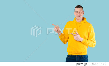 Happy caucasian man smiling and pointing aside at empty space over blue studio background, panorama