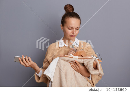 Photo of sad upset young adult woman standing with clothing in hands and holding cell phone isolated over gray background, realizing she has no money to pay for her purchases, online payment.