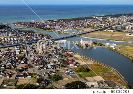 【空撮】石川県小松市 前川梯川合流地点 北陸自動車道 安宅海浜公園 こまつ水門パーク 横位置