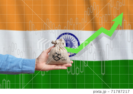 The concept of economic growth in Republic of India. Hand holds a bag with money and an upward arrow