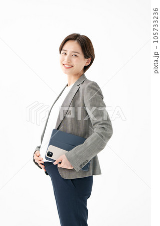 笑顔で街を歩く妊婦(ビジネスウーマン)